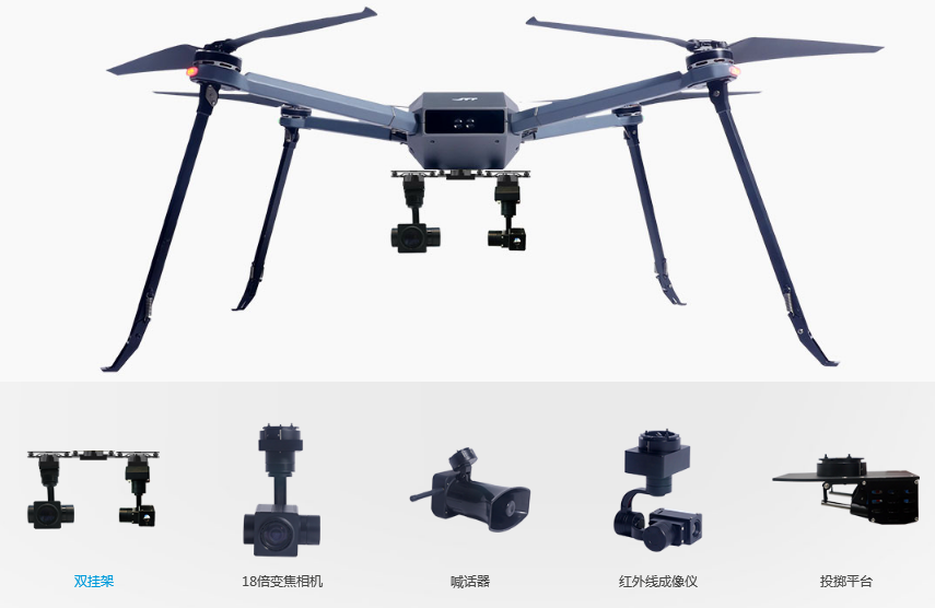 除此之外,它還具有定制化的特點,警用無人機常常搭載空中喊話、催淚瓦斯、安防監控等裝置。通過搭載不同設備可以實現不同的功能,較早在實際中應用。