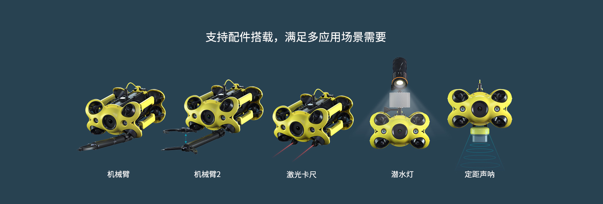 支持配件搭載,滿足多應用場景需要:機械臂,激光卡尺,潛水燈,定距聲吶。