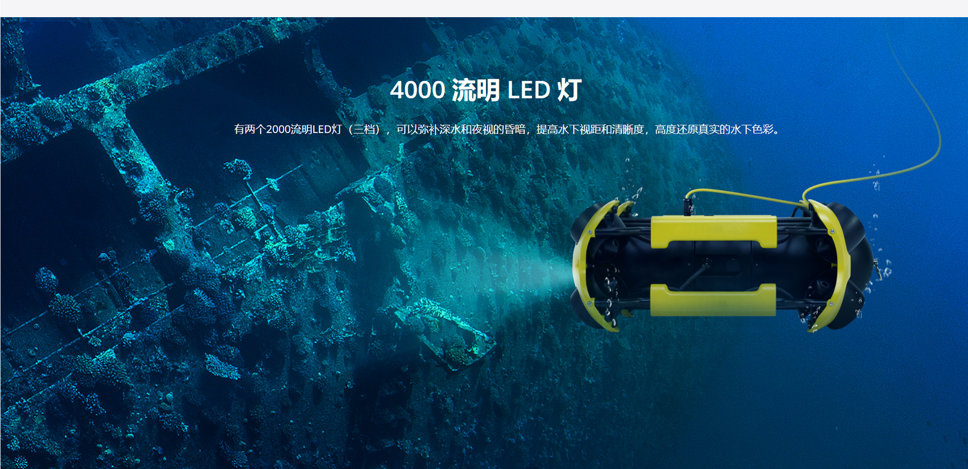4000流明 LED燈:有兩個2000流明LED燈(三檔),可以彌補深水和夜視的昏暗,提高水下視距和清晰度,高度還原真實的水下色彩。