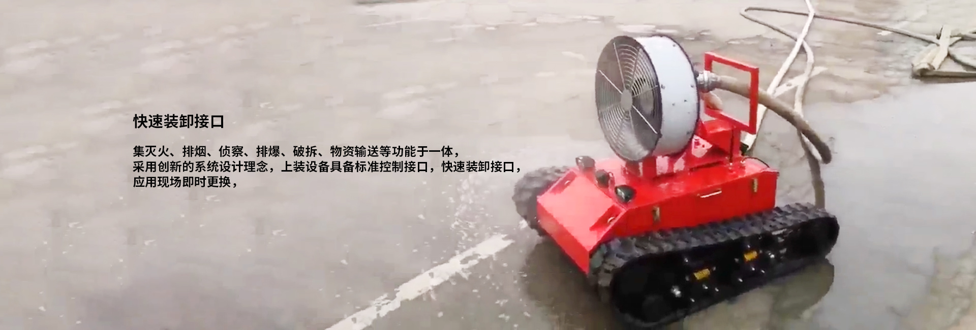 · 快速裝卸接口:集滅火、排煙、偵察、排爆、破拆、物資輸送等功能于一體,采用創(chuàng)新的系統(tǒng)設(shè)計理念,上裝設(shè)備具備標(biāo)準(zhǔn)控制接口,快速裝卸接口,應(yīng)用現(xiàn)場即時更換。