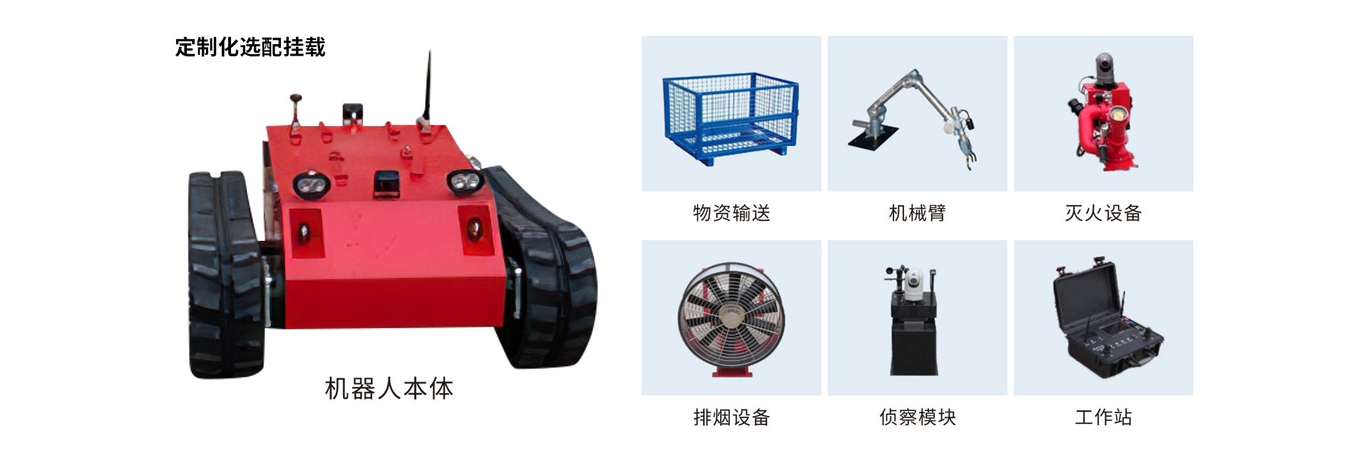 集滅火、排煙、偵察、排爆、破拆、物資輸送等功能于一體,采用創(chuàng)新的系統(tǒng)設(shè)計理念,上裝設(shè)備具備標(biāo)準(zhǔn)控制接口,快速裝卸接口,應(yīng)用現(xiàn)場即時更換,一機多用,更低的使用成本,更高的使用效率。