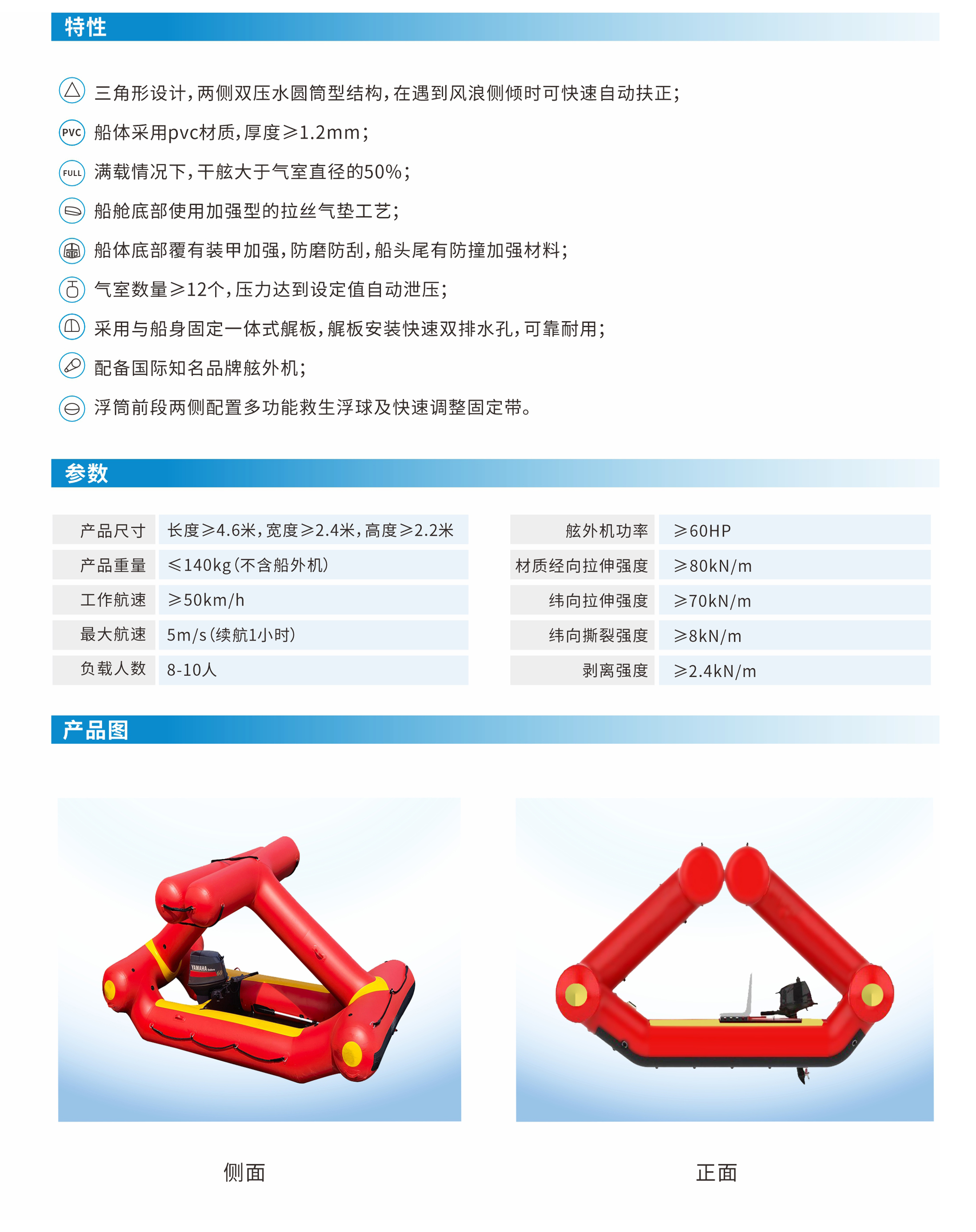 浮筒前段兩側(cè)配置多功能救生浮球及快速調(diào)整固定帶。