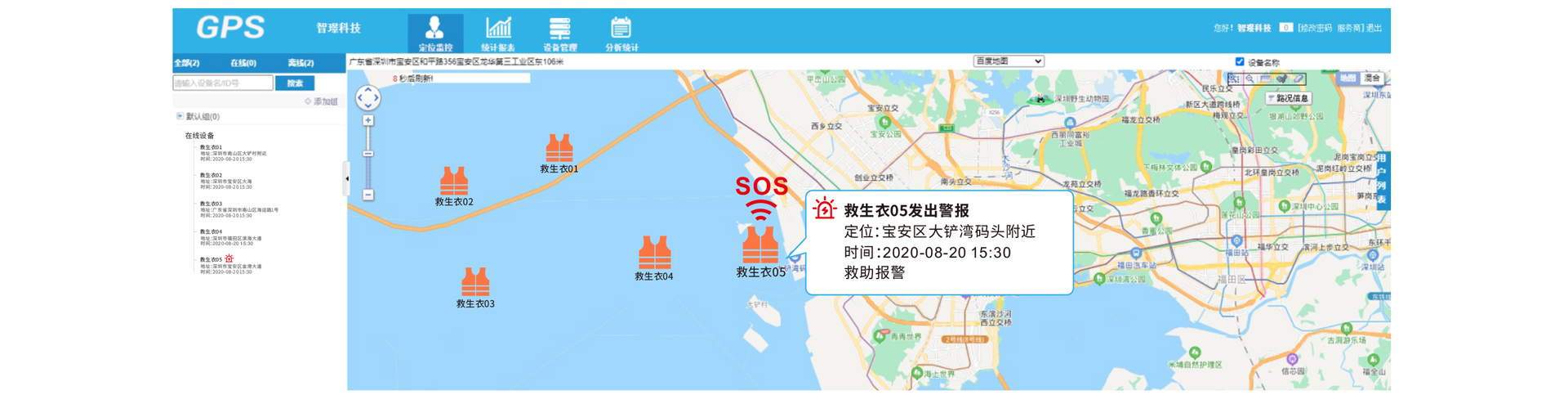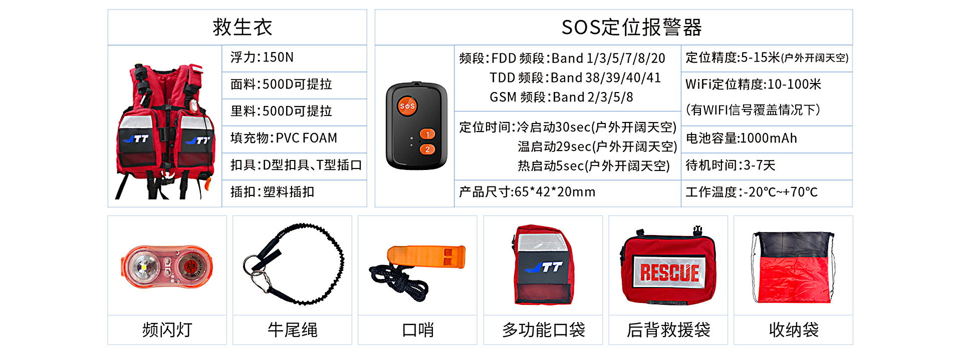 是為防汛搶險救災專門制作的,用于搶險人員穿著和救助落水人員的閉孔泡沫救生衣,可應對極端的水域情況。救生衣前胸設有PFD自救裝置,后背部設有牽引繩連接拉環(huán),同時配備哨笛、反光條、頻閃定位燈、SOS定位報警器等;具有定位功能,在手機APP及后臺管理平臺中能實時顯示定位器位置、電量、軌跡等,在緊急情況下救援人員可以通過SOS一鍵向平臺發(fā)出求救預警。它能夠隨時傳遞位置信息,大大提高救援行動效率,及保障救援人員安全。