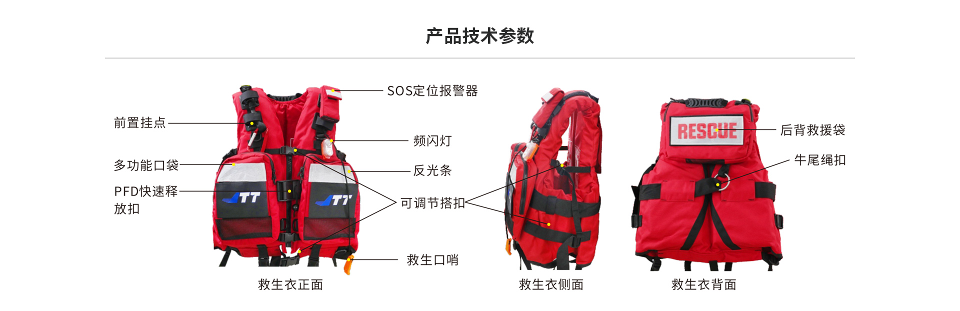 救生衣配備活餌快卸系統(tǒng):環(huán)繞胸部腰帶一條,寬5cm的尼龍織帶使用一組不銹鋼日型環(huán)及塑鋼固定,拉環(huán)上配置一根快速牽引繩可以固定于肩部,不影響救援動作
